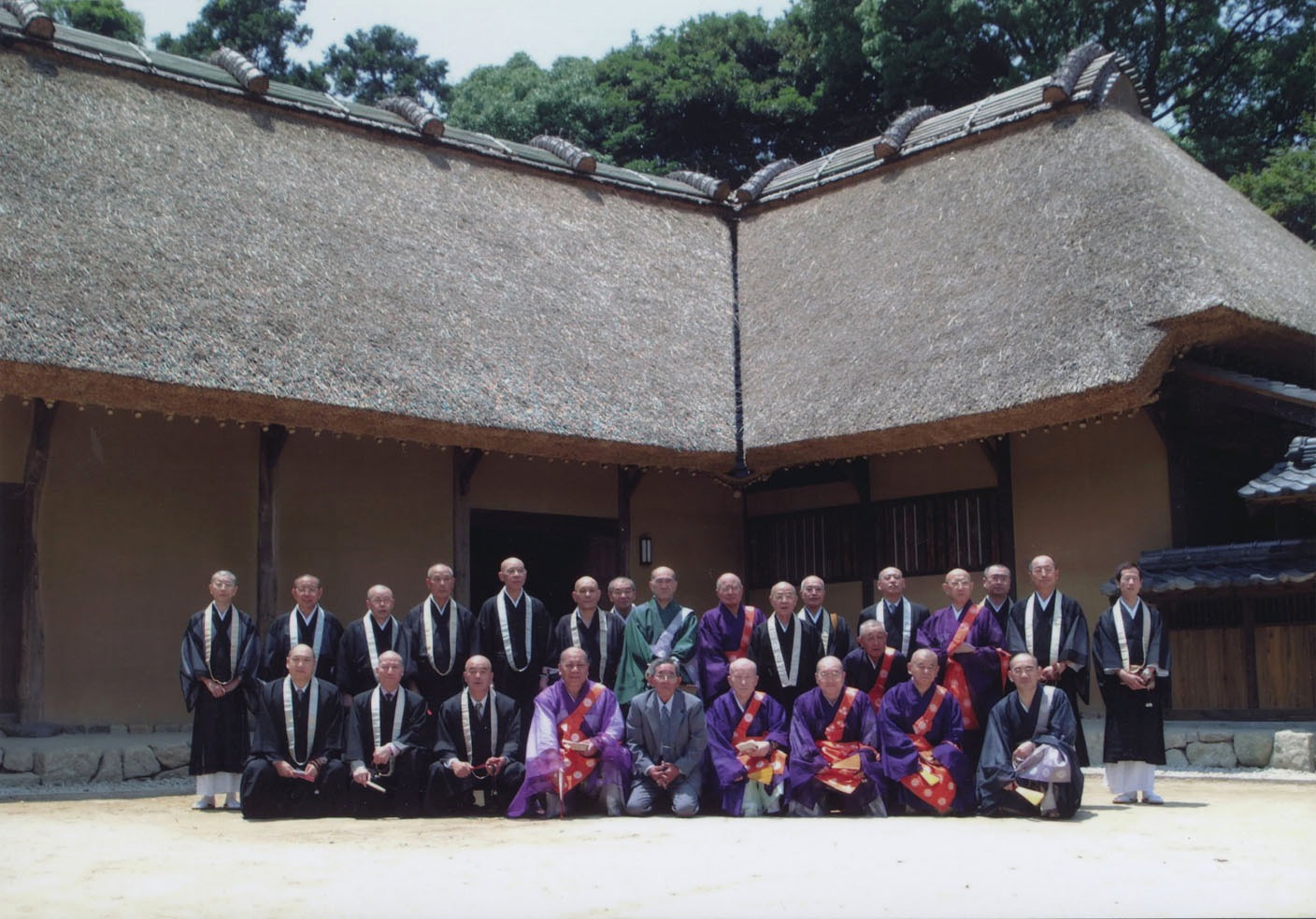 又、6月5日には天台宗開宗1200年大法会慶讃行事の一環として、比叡山延暦寺より西郊宗務総長はじめ高僧がたの御出仕があり、格別に千年家新改築落慶伝教大師報恩法要が厳修されました。非公開の中、特別に参観を許され独鈷寺様わきで法要を拝しました。 (写真右は、横大路ご当主と比叡山延暦寺西郊宗務総長を中心に記念撮影…中外日報社提供)